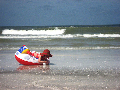so emma was a lot more reserved at the beach this time. I think having the little lifeboat gave her a sense of freedom she didn't have before. Plus the waves were strong and they hit her in the face a couple of times. She was still running and dancing all over the place but she knew when to stop and would only wade into the water up to a depth she felt comfortable in. I forget how everything is new to her. How magical it is to discover things as simple as the sound a suction cup makes or the texture of sea grass. She is so curious and energetic. I wish we lived closer to the beach or had a pool, for now the tub will have to do.